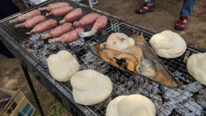 魚は縞ほっけ、身の側から焼いていきます。大きな貝は平貝。柱の直径が8cmくらいあり、刺身でも食べられるものなので、程々に火が通ったらカットしてみんなで分けました。キモの味がちょっと癖はあるものの海の味が濃くて柱に絡めて食べると「うまっ!!」という感じ。